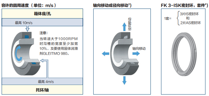 用于滾動及滑動軸承的油脂密封,如果抹上油脂,它能防止灰塵的侵入及環(huán)境濕度的影響。組合套件“FK 3-ISK”(增加溝槽底部的密封)由于迷宮的回路增加其密封效果也增加了。